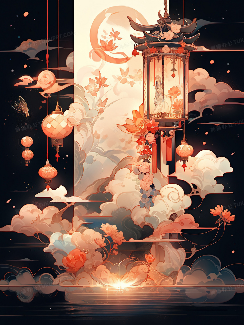 本作品内容为古色古香中国风灯笼祥云创意合成插画, 格式为 jpg, 大小6 MB, 图片尺寸为1856 x 2464, 源文件无水印, 欢迎使用熊猫办公。 如认为平台内容涉嫌侵权,可通过邮件:tousu@tukuppt.com提出书面通知,我们将及时处理。