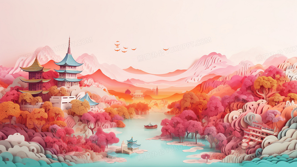 本作品内容为彩色唯美剪纸风山水风景插画, 格式为 jpg, 大小6 MB, 图片尺寸为2912 x 1632, 源文件无水印, 欢迎使用熊猫办公。 如认为平台内容涉嫌侵权,可通过邮件:tousu@tukuppt.com提出书面通知,我们将及时处理。