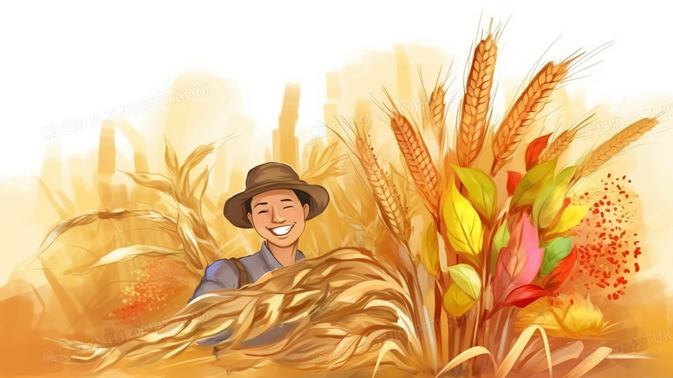 本作品内容为金色面带笑容收获小麦的农民插画, 格式为 jpg, 大小5 MB, 图片尺寸为2912 x 1632, 源文件无水印, 欢迎使用熊猫办公。 如认为平台内容涉嫌侵权,可通过邮件:tousu@tukuppt.com提出书面通知,我们将及时处理。