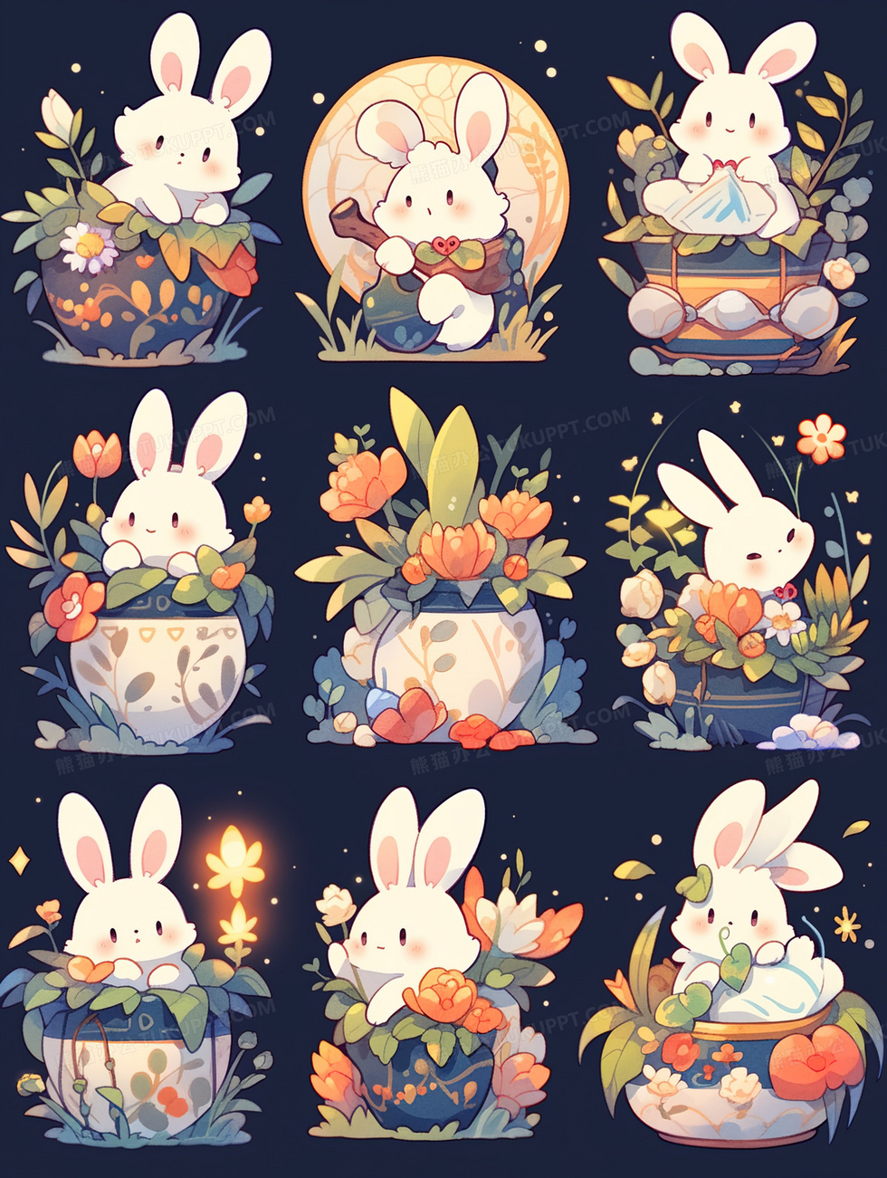 本作品内容为九宫格中国风花朵小白兔可爱卡通插画, 格式为 jpg, 大小6 MB, 图片尺寸为1856 x 2464, 源文件无水印, 欢迎使用熊猫办公。 如认为平台内容涉嫌侵权,可通过邮件:tousu@tukuppt.com提出书面通知,我们将及时处理。