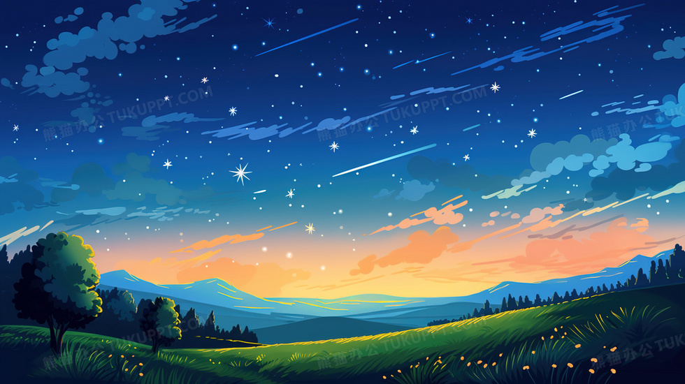 本作品内容为唯美夏日夜晚风景插画, 格式为 jpg, 大小5 MB, 图片尺寸为2912 x 1632, 源文件无水印, 欢迎使用熊猫办公。 如认为平台内容涉嫌侵权,可通过邮件:tousu@tukuppt.com提出书面通知,我们将及时处理。