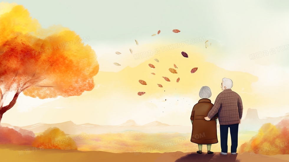 本作品内容为秋季老年人陪伴看风景插画, 格式为 jpg, 大小5 MB, 图片尺寸为2912 x 1632, 源文件无水印, 欢迎使用熊猫办公。 如认为平台内容涉嫌侵权,可通过邮件:tousu@tukuppt.com提出书面通知,我们将及时处理。