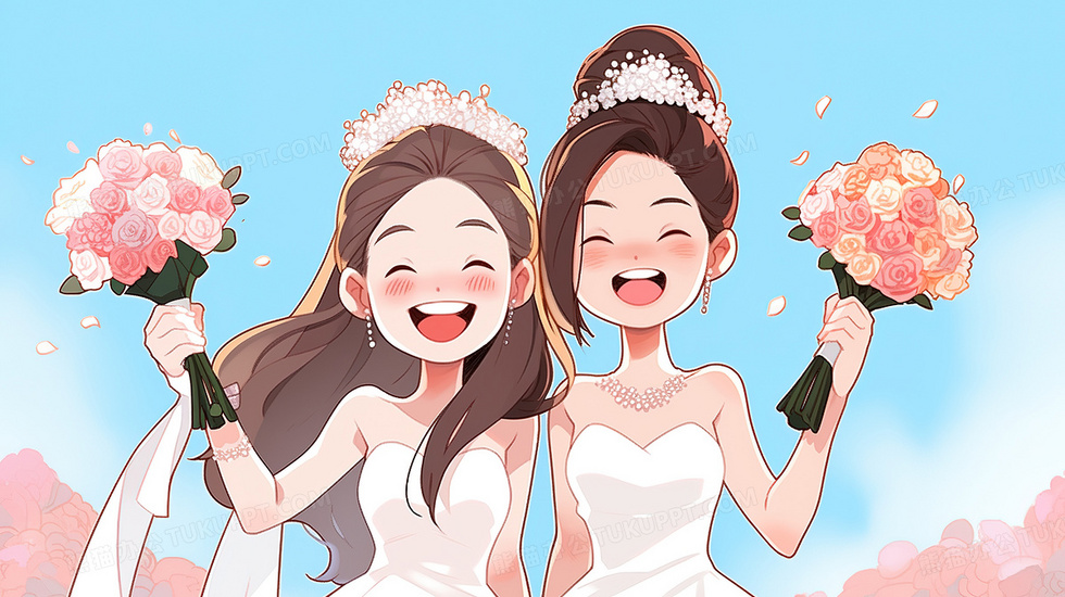 首页 > 插画 > 科技艺术 > 卡通漫画 > 两个拿着手捧花的新娘在开心的笑着