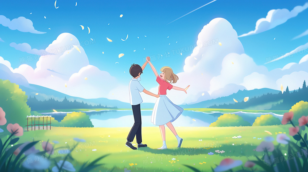 本作品内容为可爱小情侣湖边草地上跳舞插画, 格式为 jpg, 大小3 MB, 图片尺寸为2912 x 1632, 源文件无水印, 欢迎使用熊猫办公。 如认为平台内容涉嫌侵权,可通过邮件:tousu@tukuppt.com提出书面通知,我们将及时处理。