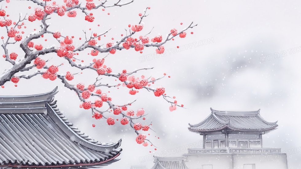 本作品内容为冬季古建筑梅花插画, 格式为 jpg, 大小6 MB, 图片尺寸为2912 x 1632, 源文件无水印, 欢迎使用熊猫办公。 如认为平台内容涉嫌侵权,可通过邮件:tousu@tukuppt.com提出书面通知,我们将及时处理。