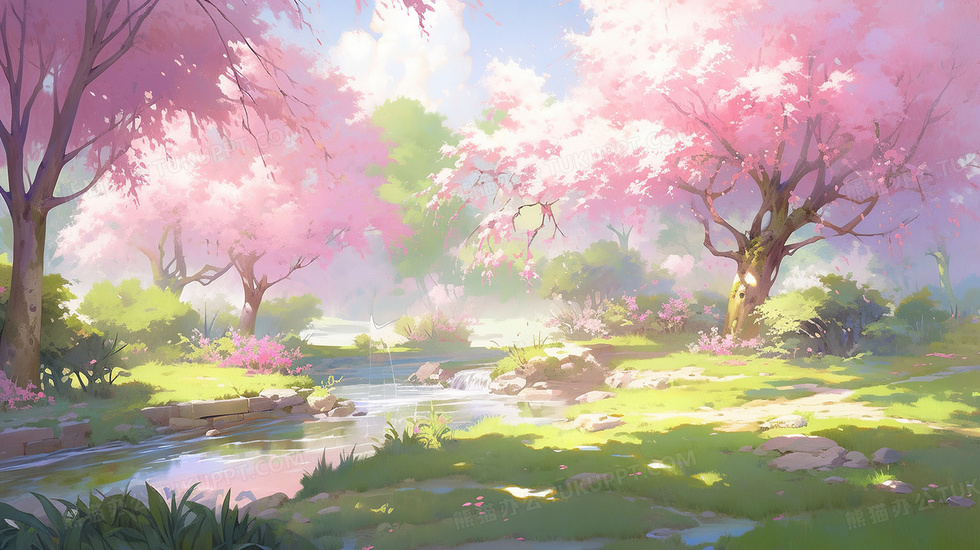 首页 > 插画 > 科技艺术 > 水彩手绘 > 粉色唯美樱花树春天草地蓝天白云自然风景插画