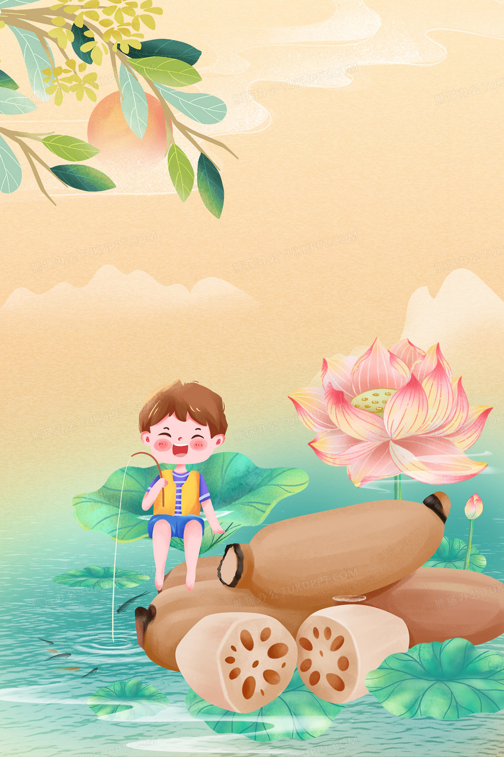 本作品内容为夏季中国传统植物莲藕男孩垂钓插画风背景, 格式为 psd, 大小85 MB, 图片尺寸为3543 x 5315, 作品中背景图片无需修改, 源文件无水印,可以直接使用, 欢迎使用熊猫办公。 如认为平台内容涉嫌侵权,可通过邮件:tousu@tukuppt.com提出书面通知,我们将及时处理。