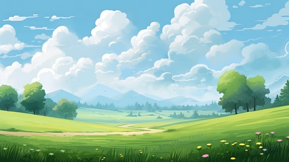 本作品内容为春季蓝天白云下的翠绿色的草原插画, 格式为 jpg, 大小4 MB, 图片尺寸为2912 x 1632, 源文件无水印, 欢迎使用熊猫办公。 如认为平台内容涉嫌侵权,可通过邮件:tousu@tukuppt.com提出书面通知,我们将及时处理。
