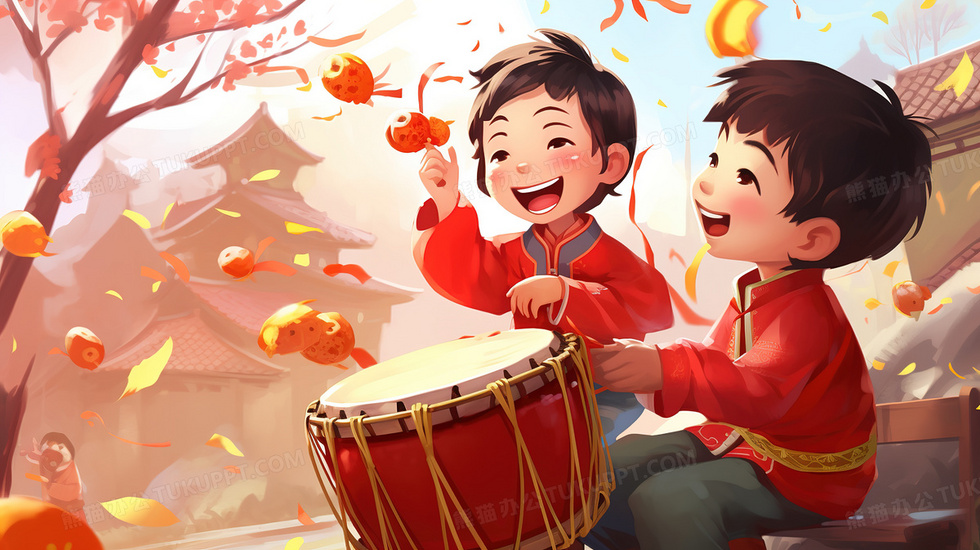 本作品内容为春节假期里一起敲鼓玩耍的孩子们插画, 格式为 jpg, 大小5 MB, 图片尺寸为2912 x 1632, 源文件无水印, 欢迎使用熊猫办公。 如认为平台内容涉嫌侵权,可通过邮件:tousu@tukuppt.com提出书面通知,我们将及时处理。