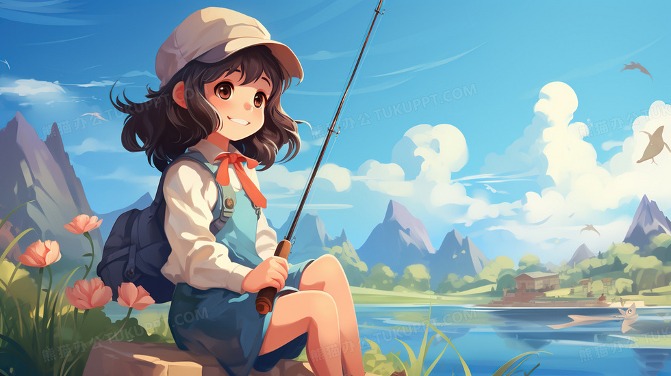 本作品内容为卡通小女孩在河边钓鱼场景插画, 格式为 jpg, 大小5 MB, 图片尺寸为2912 x 1632, 源文件无水印, 欢迎使用熊猫办公。 如认为平台内容涉嫌侵权,可通过邮件:tousu@tukuppt.com提出书面通知,我们将及时处理。