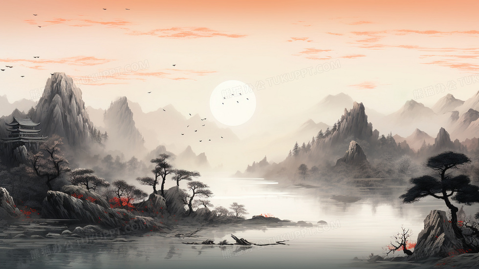 本作品内容为中国风水墨山水意境风景插画, 格式为 jpg, 大小5 MB, 图片尺寸为2912 x 1632, 源文件无水印, 欢迎使用熊猫办公。 如认为平台内容涉嫌侵权,可通过邮件:tousu@tukuppt.com提出书面通知,我们将及时处理。