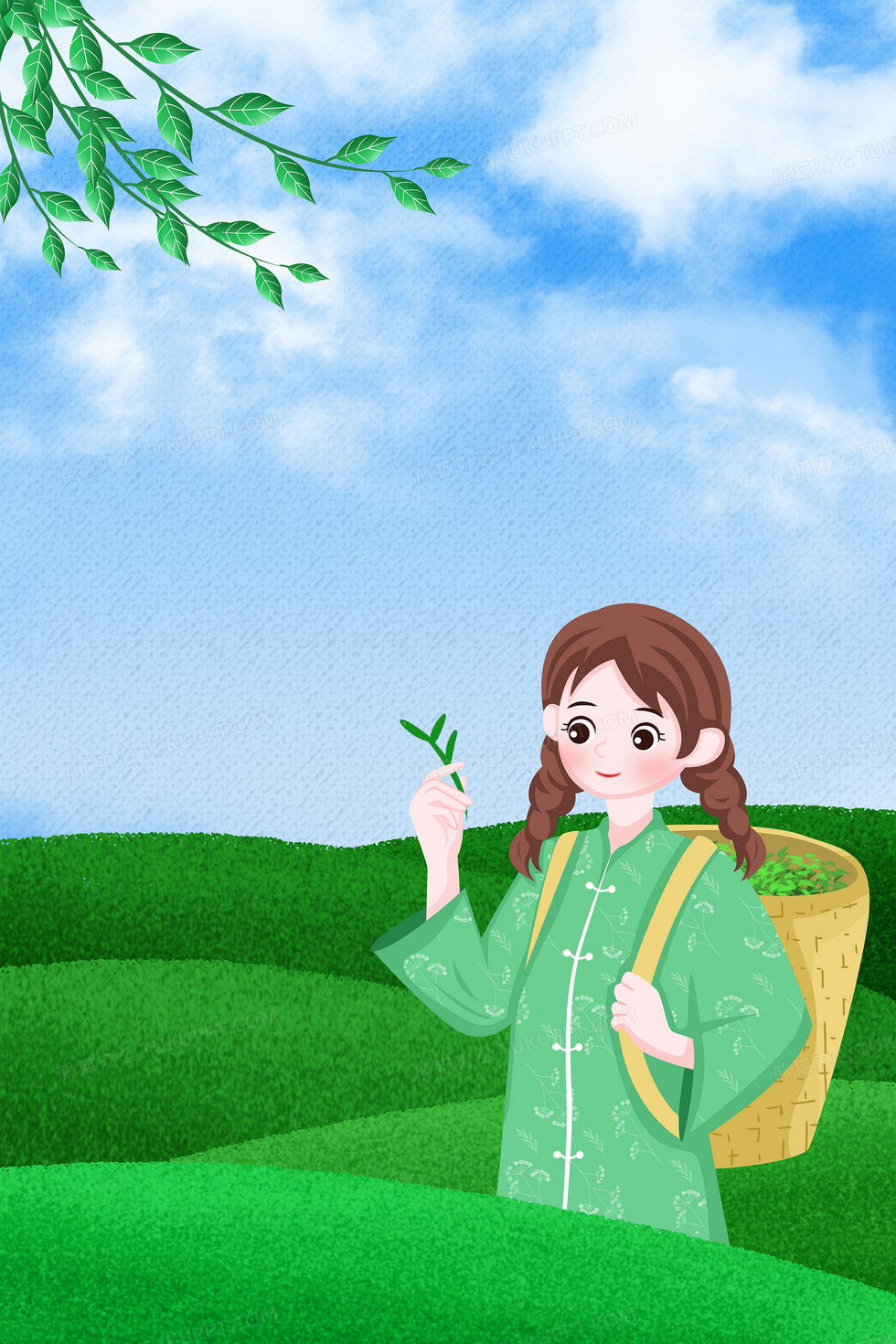 本作品内容为谷雨之小清新采茶背景, 格式为 psd, 大小80 MB, 图片尺寸为3543 x 5315, 作品中背景图片无需修改, 源文件无水印,可以直接使用, 欢迎使用熊猫办公。 如认为平台内容涉嫌侵权,可通过邮件:tousu@tukuppt.com提出书面通知,我们将及时处理。