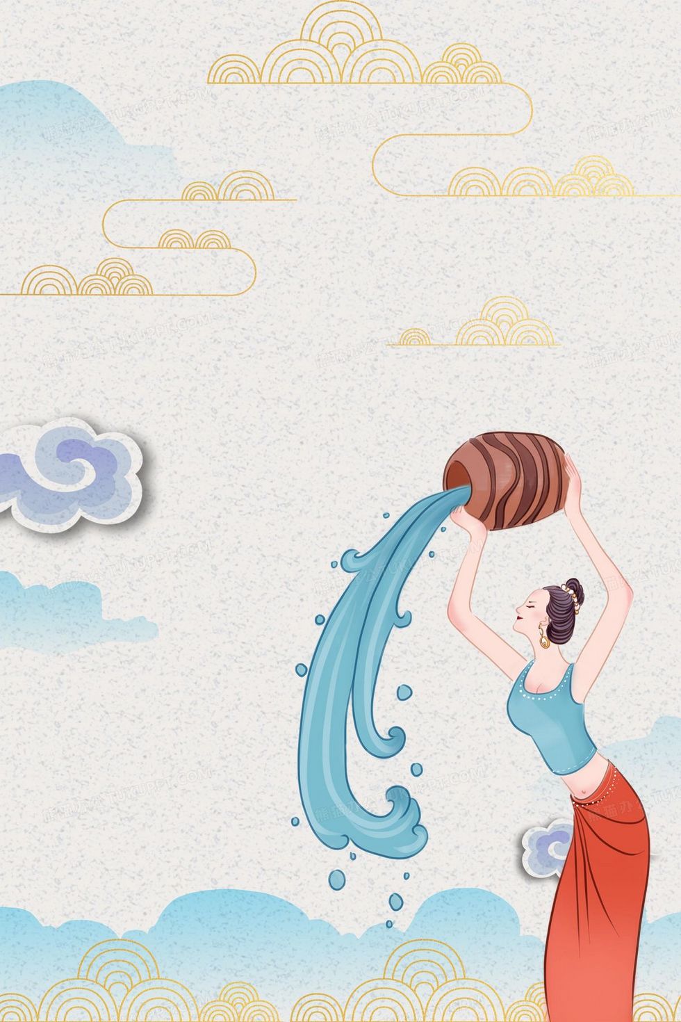 本作品内容为中国风传统画风泼水节背景, 格式为 psd, 大小16 MB, 图片尺寸为2362 x 3543, 作品中背景图片无需修改, 源文件无水印,可以直接使用, 欢迎使用熊猫办公。 如认为平台内容涉嫌侵权,可通过邮件:tousu@tukuppt.com提出书面通知,我们将及时处理。