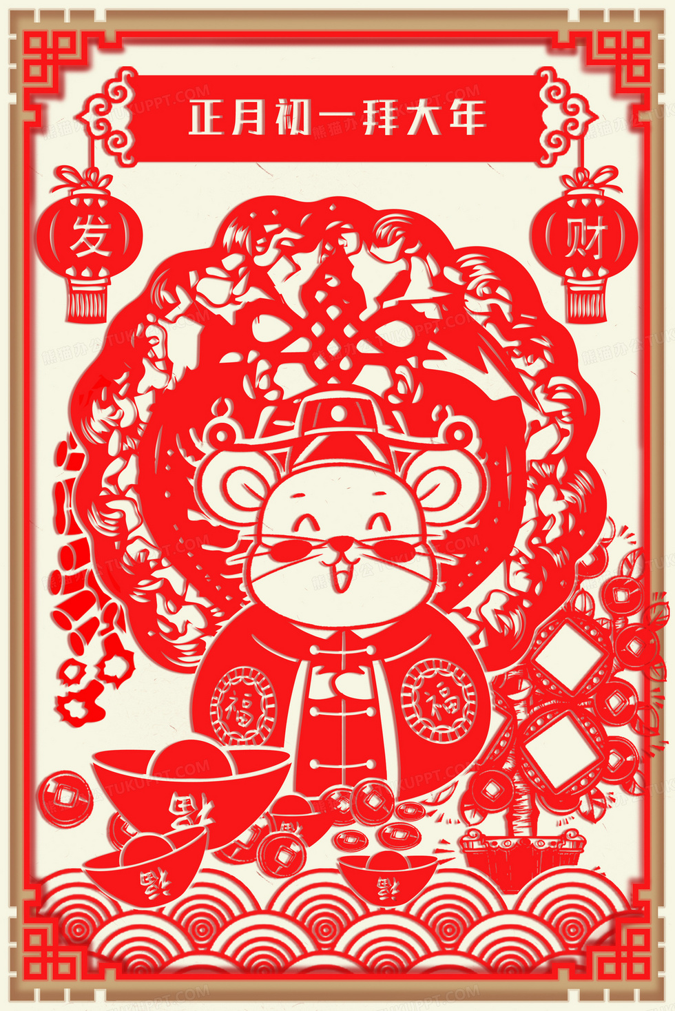 本作品内容为鼠年创意手绘剪纸风习俗插画, 格式为 psd, 大小9 MB, 图片尺寸为2343 x 3508, 作品中背景图片无需修改, 源文件无水印,可以直接使用, 欢迎使用熊猫办公。 如认为平台内容涉嫌侵权,可通过邮件:tousu@tukuppt.com提出书面通知,我们将及时处理。