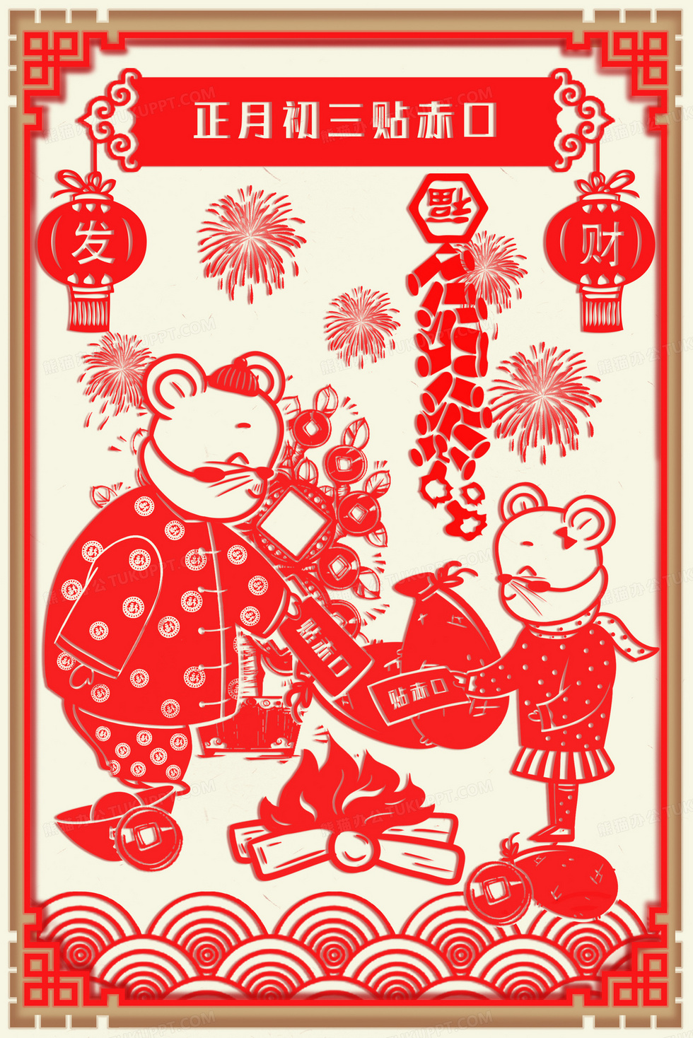 本作品内容为鼠年习俗贴赤口装饰背景, 格式为 psd, 大小15 MB, 图片尺寸为2343 x 3508, 作品中背景图片无需修改, 源文件无水印,可以直接使用, 欢迎使用熊猫办公。 如认为平台内容涉嫌侵权,可通过邮件:tousu@tukuppt.com提出书面通知,我们将及时处理。