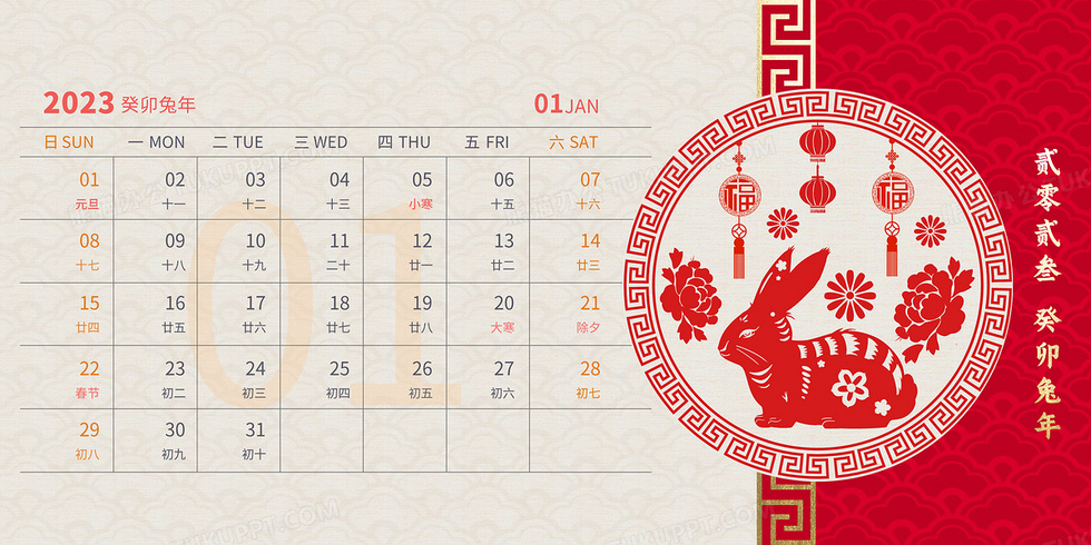 本作品内容为红色烫金兔年一月日历装饰素材, 格式为 psd, 大小55 MB, 图片尺寸为4724 x 2362, 作品中背景图片无需修改, 源文件无水印,可以直接使用, 欢迎使用熊猫办公。 如认为平台内容涉嫌侵权,可通过邮件:tousu@tukuppt.com提出书面通知,我们将及时处理。