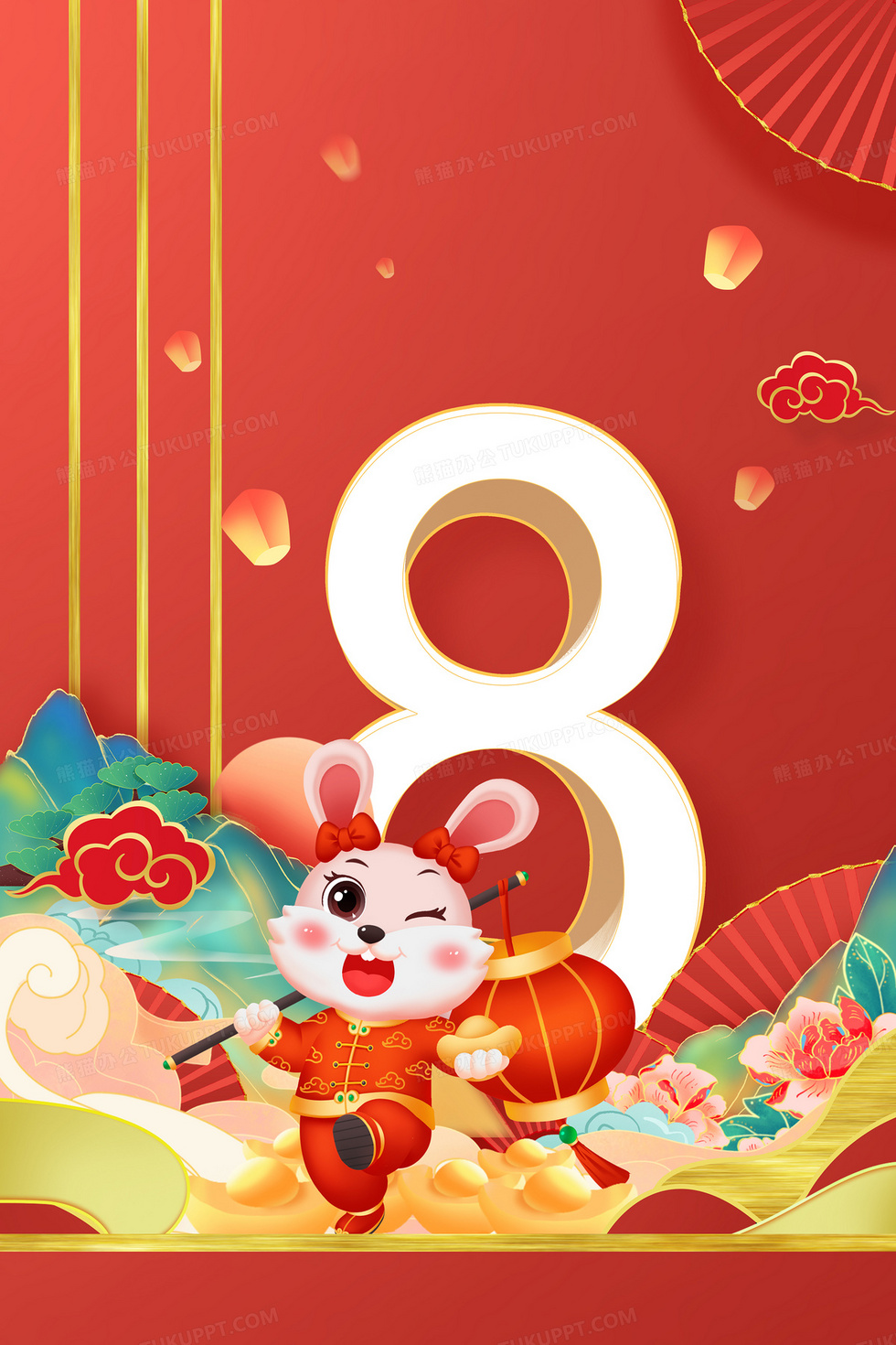 本作品内容为2023兔年新年喜庆国潮中国风倒计时数字8背景, 格式为 psd, 大小104 MB, 图片尺寸为3543 x 5315, 作品中背景图片无需修改, 源文件无水印,可以直接使用, 欢迎使用熊猫办公。 如认为平台内容涉嫌侵权,可通过邮件:tousu@tukuppt.com提出书面通知,我们将及时处理。