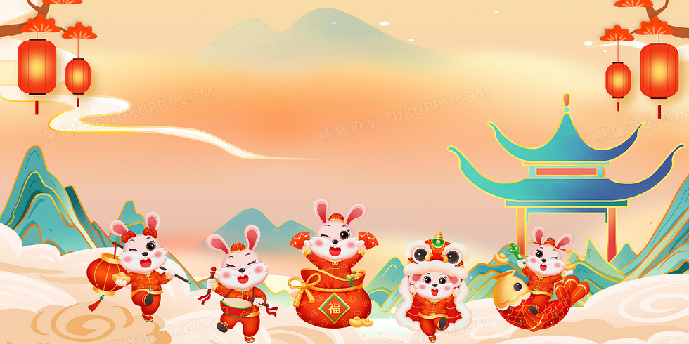 本作品内容为国潮风格兔年喜庆全家福背景, 格式为 psd, 大小55 MB, 图片尺寸为4724 x 2362, 作品中背景图片无需修改, 源文件无水印,可以直接使用, 欢迎使用熊猫办公。 如认为平台内容涉嫌侵权,可通过邮件:tousu@tukuppt.com提出书面通知,我们将及时处理。