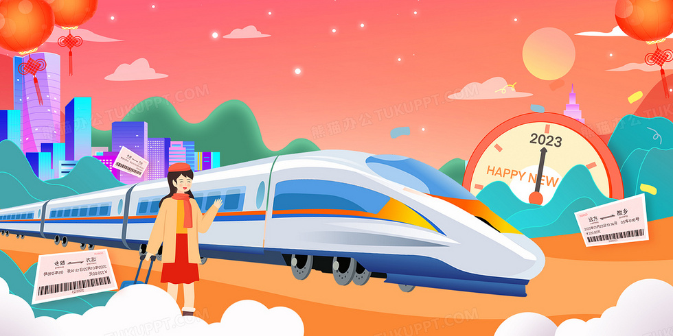 本作品内容为矢量插画风坐高铁春运回家过年背景, 格式为 psd, 大小12 MB, 图片尺寸为4724 x 2362, 作品中背景图片无需修改, 源文件无水印,可以直接使用, 欢迎使用熊猫办公。 如认为平台内容涉嫌侵权,可通过邮件:tousu@tukuppt.com提出书面通知,我们将及时处理。