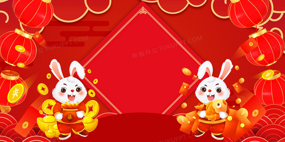 本作品内容为红色喜庆双兔迎新春背景图, 格式为 psd, 大小47 MB, 图片尺寸为4724 x 2362, 作品中背景图片无需修改, 源文件无水印,可以直接使用, 欢迎使用熊猫办公。 如认为平台内容涉嫌侵权,可通过邮件:tousu@tukuppt.com提出书面通知,我们将及时处理。