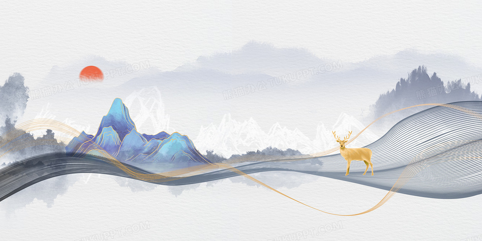 本作品内容为新中式山水水墨山水鎏金线条创意中国风背景, 格式为 psd, 大小42 MB, 图片尺寸为4724 x 2362, 作品中背景图片无需修改, 源文件无水印,可以直接使用, 欢迎使用熊猫办公。 如认为平台内容涉嫌侵权,可通过邮件:tousu@tukuppt.com提出书面通知,我们将及时处理。