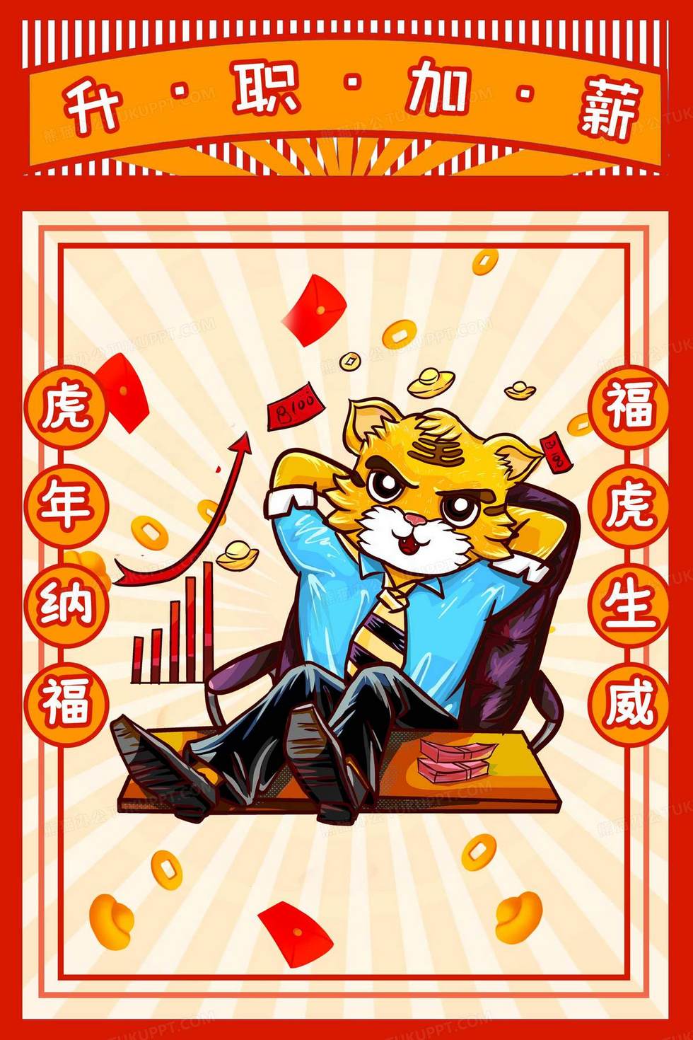 本作品内容为虎年趣味升职加薪新年壁纸手机屏保背景, 格式为 psd, 大小7 MB, 图片尺寸为2362 x 3543, 作品中背景图片无需修改, 源文件无水印,可以直接使用, 欢迎使用熊猫办公。 如认为平台内容涉嫌侵权,可通过邮件:tousu@tukuppt.com提出书面通知,我们将及时处理。