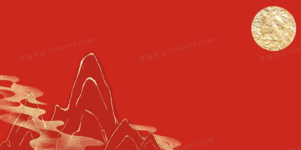 本作品内容为红色简约中国风鎏金山水景色背景, 格式为 psd, 大小35 MB, 图片尺寸为4724 x 2362, 作品中背景图片无需修改, 源文件无水印,可以直接使用, 欢迎使用熊猫办公。 如认为平台内容涉嫌侵权,可通过邮件:tousu@tukuppt.com提出书面通知,我们将及时处理。
