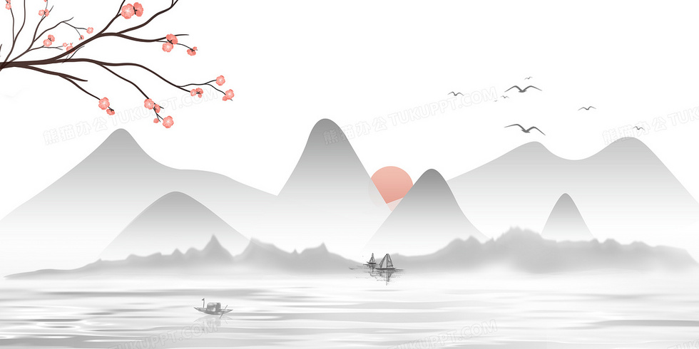 本作品内容为简约水墨画山水桃花背景, 格式为 psd, 大小11 MB, 图片尺寸为4722 x 2361, 作品中背景图片无需修改, 源文件无水印,可以直接使用, 欢迎使用熊猫办公。 如认为平台内容涉嫌侵权,可通过邮件:tousu@tukuppt.com提出书面通知,我们将及时处理。