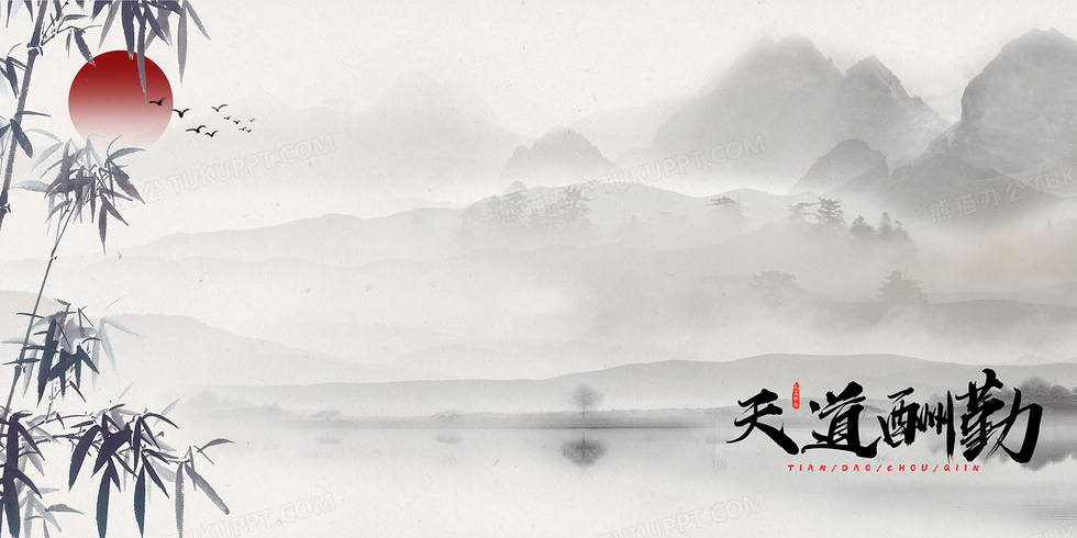 本作品内容为中国风水墨天道酬勤背景, 格式为 psd, 大小111 MB, 图片尺寸为4724 x 2362, 作品中背景图片无需修改, 源文件无水印,可以直接使用, 欢迎使用熊猫办公。 如认为平台内容涉嫌侵权,可通过邮件:tousu@tukuppt.com提出书面通知,我们将及时处理。