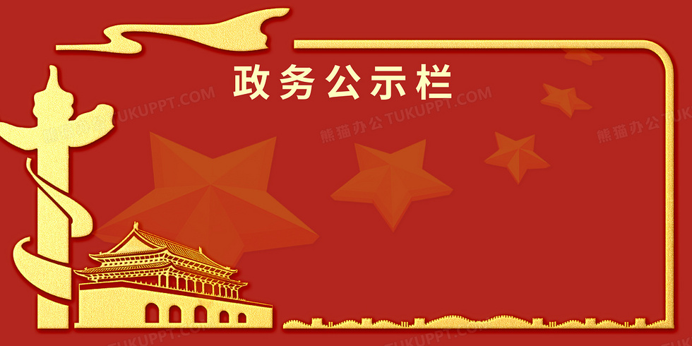 本作品内容为创意红色政务公示栏边框背景, 格式为 psd, 大小20 MB, 图片尺寸为4724 x 2362, 作品中背景图片无需修改, 源文件无水印,可以直接使用, 欢迎使用熊猫办公。 如认为平台内容涉嫌侵权,可通过邮件:tousu@tukuppt.com提出书面通知,我们将及时处理。