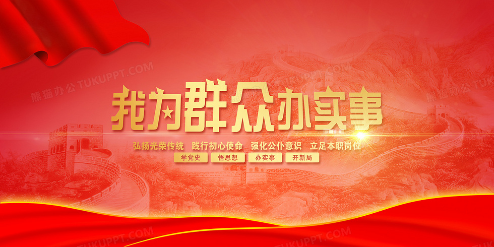 本作品内容为红金大气我为群众办实事党政背景, 格式为 psd, 大小78 MB, 图片尺寸为4724 x 2362, 作品中背景图片无需修改, 源文件无水印,可以直接使用, 欢迎使用熊猫办公。 如认为平台内容涉嫌侵权,可通过邮件:tousu@tukuppt.com提出书面通知,我们将及时处理。