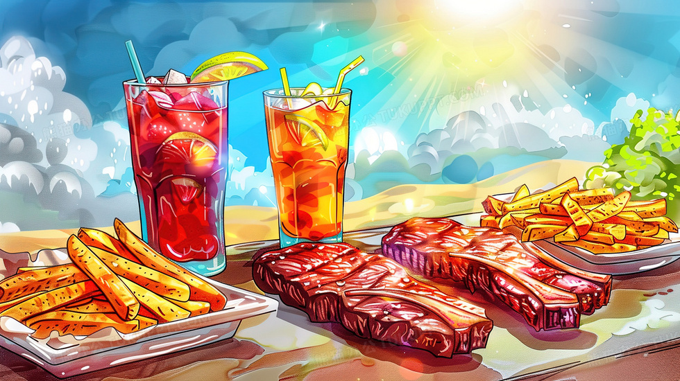 本作品内容为美食烤肉饮料插画, 格式为 jpg, 大小4 MB, 图片尺寸为2912 x 1632, 源文件无水印, 欢迎使用熊猫办公。 如认为平台内容涉嫌侵权,可通过邮件:tousu@tukuppt.com提出书面通知,我们将及时处理。
