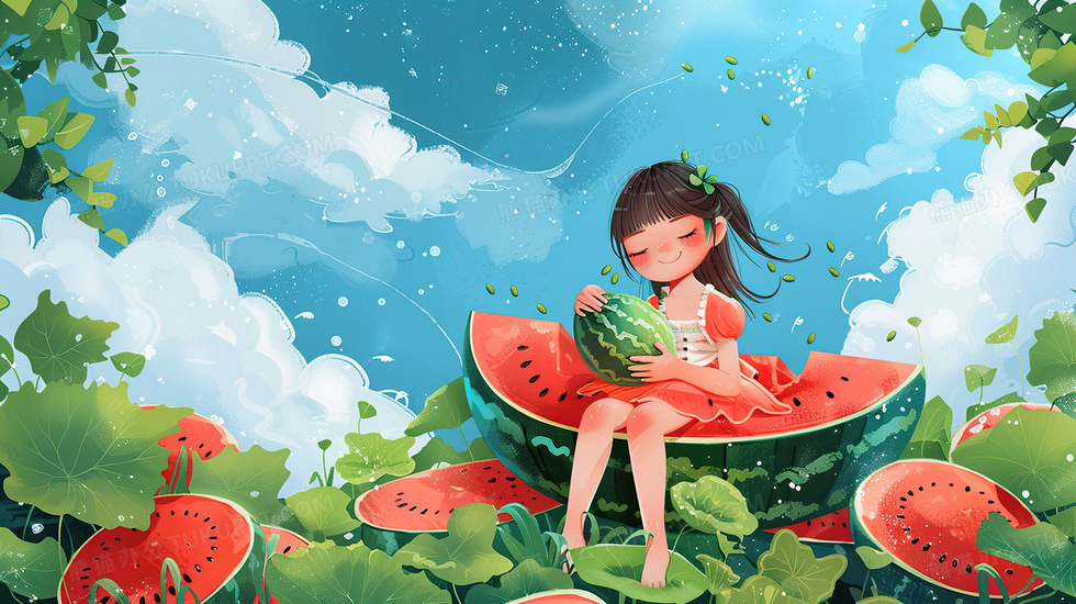 本作品内容为卡通立夏女孩吃西瓜夏日插画, 格式为 jpg, 大小4 MB, 图片尺寸为2912 x 1632, 源文件无水印, 欢迎使用熊猫办公。 如认为平台内容涉嫌侵权,可通过邮件:tousu@tukuppt.com提出书面通知,我们将及时处理。