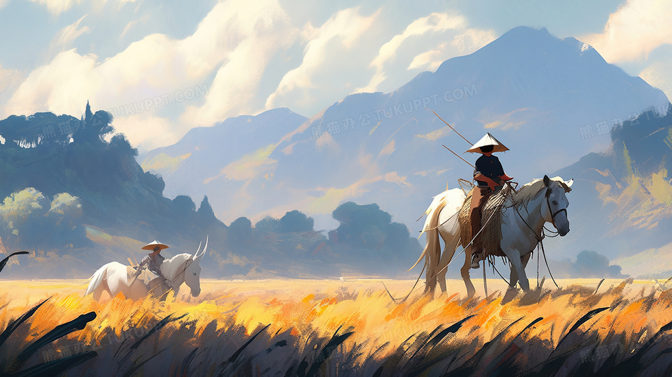 本作品内容为古代草原上骑马的人插画, 格式为 jpg, 大小3 MB, 图片尺寸为2912 x 1632, 源文件无水印, 欢迎使用熊猫办公。 如认为平台内容涉嫌侵权,可通过邮件:tousu@tukuppt.com提出书面通知,我们将及时处理。