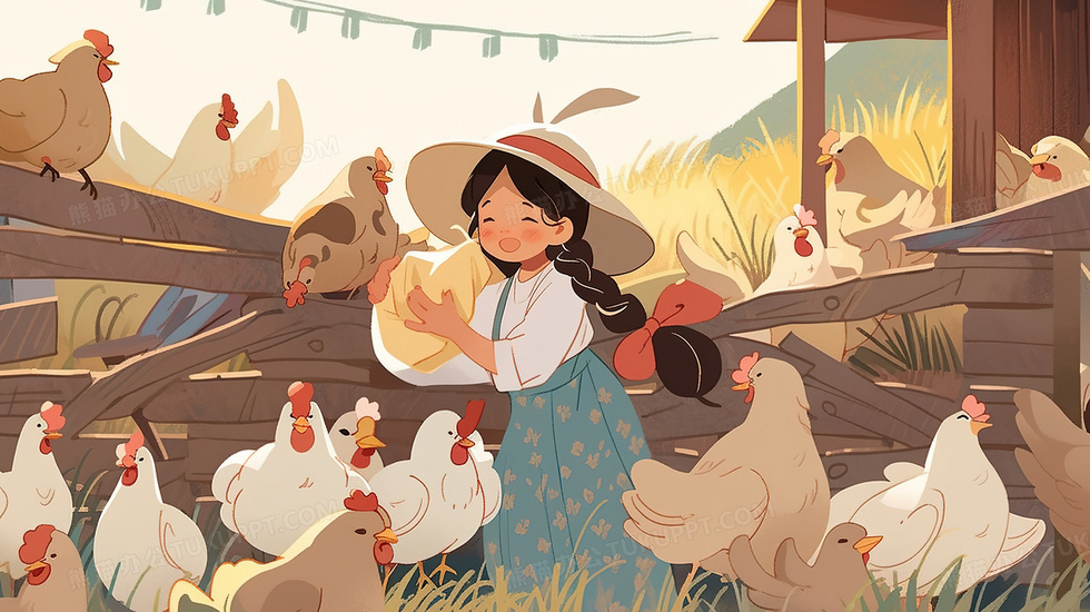 本作品内容为农村少女饲养鸡群插画, 格式为 jpg, 大小3 MB, 图片尺寸为2912 x 1632, 源文件无水印, 欢迎使用熊猫办公。 如认为平台内容涉嫌侵权,可通过邮件:tousu@tukuppt.com提出书面通知,我们将及时处理。