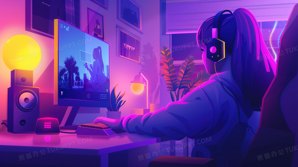 本作品内容为熬夜电脑打游戏的女孩插画, 格式为 jpg, 大小2 MB, 图片尺寸为2912 x 1632, 源文件无水印, 欢迎使用熊猫办公。 如认为平台内容涉嫌侵权,可通过邮件:tousu@tukuppt.com提出书面通知,我们将及时处理。