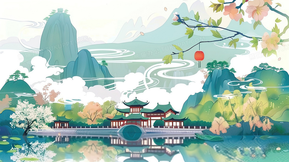 本作品内容为春季山边湖中的中式阁楼插画, 格式为 jpg, 大小3 MB, 图片尺寸为2912 x 1632, 源文件无水印, 欢迎使用熊猫办公。 如认为平台内容涉嫌侵权,可通过邮件:tousu@tukuppt.com提出书面通知,我们将及时处理。