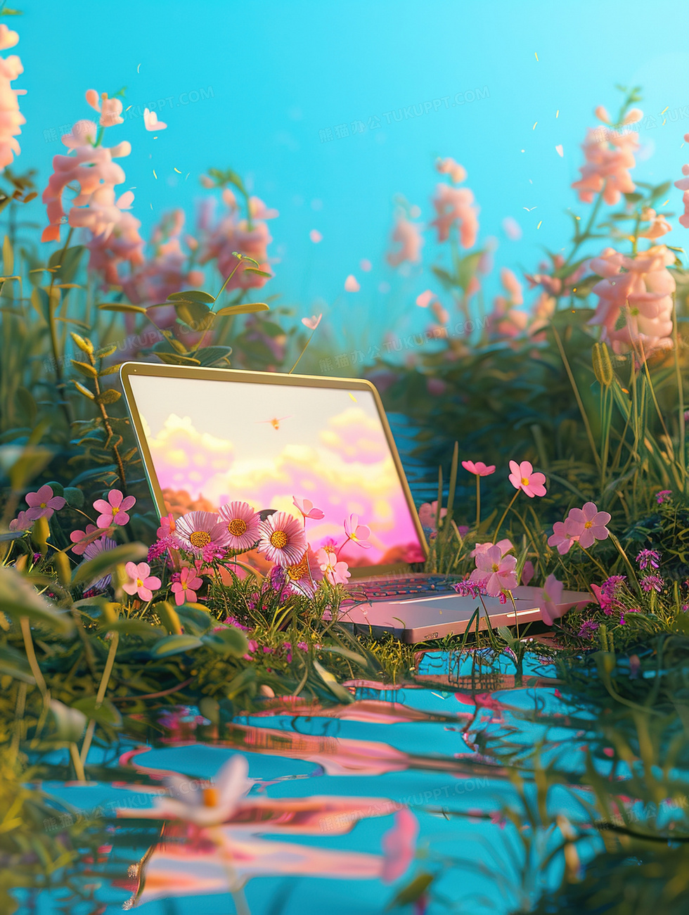 本作品内容为3D花草丛中的溪流旁摆放着的笔记本电脑插画, 格式为 jpg, 大小3 MB, 图片尺寸为1856 x 2464, 源文件无水印, 欢迎使用熊猫办公。 如认为平台内容涉嫌侵权,可通过邮件:tousu@tukuppt.com提出书面通知,我们将及时处理。