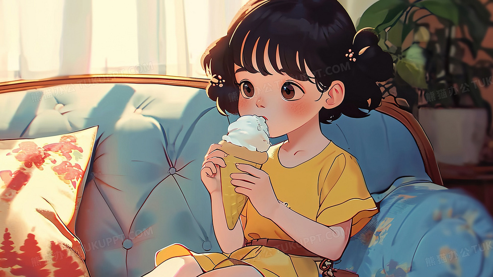 本作品内容为沙发上吃冰淇淋的短发女孩插画, 格式为 jpg, 大小2 MB, 图片尺寸为2912 x 1632, 源文件无水印, 欢迎使用熊猫办公。 如认为平台内容涉嫌侵权,可通过邮件:tousu@tukuppt.com提出书面通知,我们将及时处理。