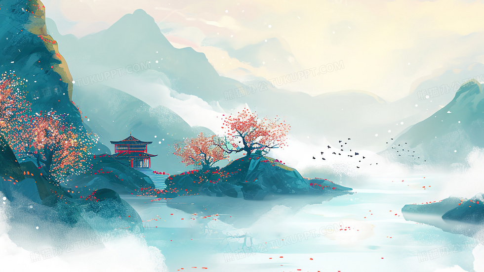 本作品内容为雾气袅绕的丛山山谷河流山水插画, 格式为 jpg, 大小3 MB, 图片尺寸为2912 x 1632, 源文件无水印, 欢迎使用熊猫办公。 如认为平台内容涉嫌侵权,可通过邮件:tousu@tukuppt.com提出书面通知,我们将及时处理。