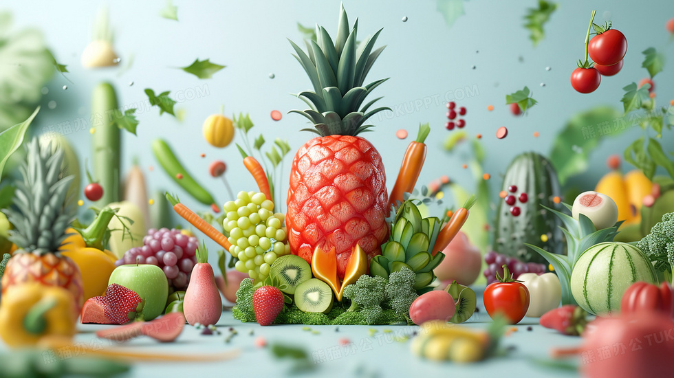 本作品内容为彩色3D立体蔬菜水果创意图片, 格式为 jpg, 大小3 MB, 图片尺寸为2912 x 1632, 源文件无水印, 欢迎使用熊猫办公。 如认为平台内容涉嫌侵权,可通过邮件:tousu@tukuppt.com提出书面通知,我们将及时处理。