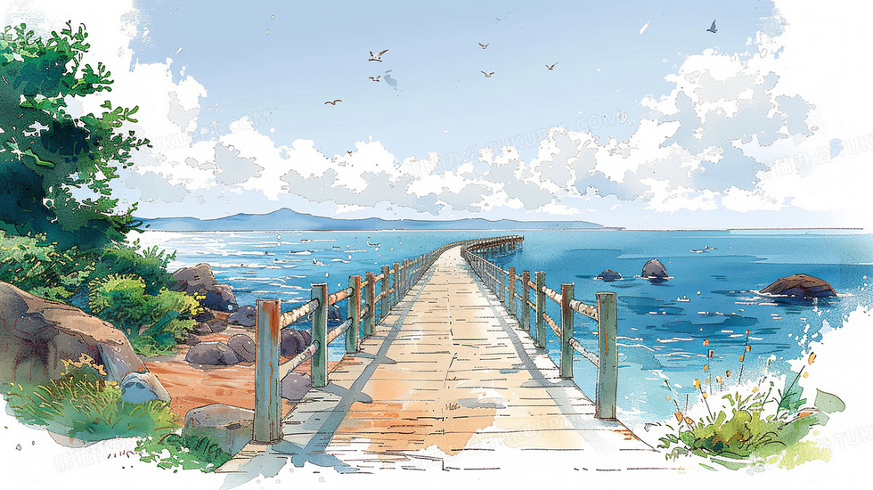 本作品内容为夏天海边栈桥水彩插画, 格式为 jpg, 大小4 MB, 图片尺寸为2912 x 1632, 源文件无水印, 欢迎使用熊猫办公。 如认为平台内容涉嫌侵权,可通过邮件:tousu@tukuppt.com提出书面通知,我们将及时处理。