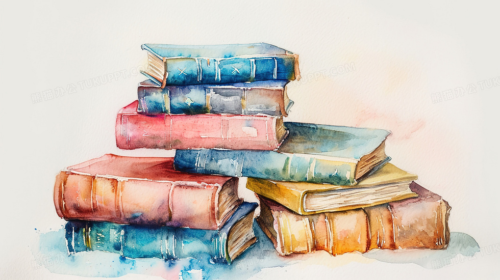 本作品内容为彩色水彩质感书籍摆放插画, 格式为 jpg, 大小3 MB, 图片尺寸为2912 x 1632, 源文件无水印, 欢迎使用熊猫办公。 如认为平台内容涉嫌侵权,可通过邮件:tousu@tukuppt.com提出书面通知,我们将及时处理。
