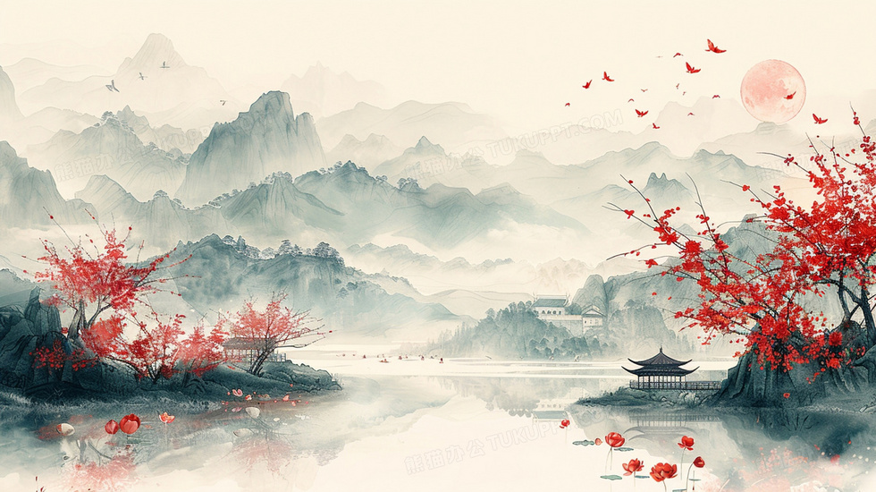 本作品内容为中国风水墨山水自然艺术插画, 格式为 jpg, 大小2 MB, 图片尺寸为2240 x 1256, 源文件无水印, 欢迎使用熊猫办公。 如认为平台内容涉嫌侵权,可通过邮件:tousu@tukuppt.com提出书面通知,我们将及时处理。