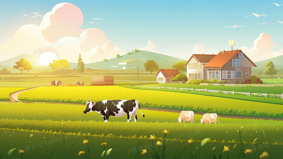 本作品内容为绿色唯美乡村田园奶牛牧场风景插画, 格式为 jpg, 大小3 MB, 图片尺寸为2912 x 1632, 源文件无水印, 欢迎使用熊猫办公。 如认为平台内容涉嫌侵权,可通过邮件:tousu@tukuppt.com提出书面通知,我们将及时处理。
