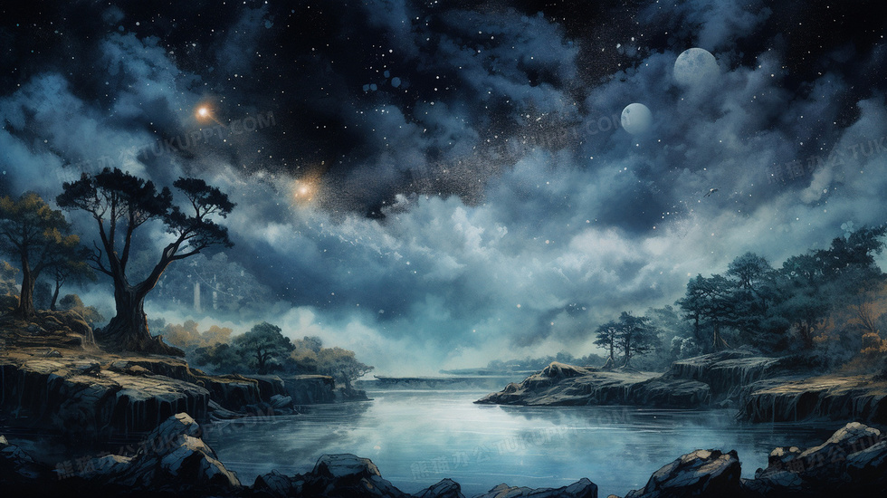 首页 > 插画 > 科技艺术 > 中国风 > 唯美水墨国风星空山水景色插画