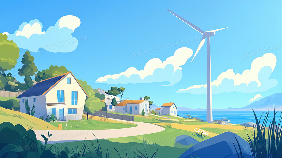 本作品内容为清洁能源风力发电风车与民房插画, 格式为 jpg, 大小3 MB, 图片尺寸为2912 x 1632, 源文件无水印, 欢迎使用熊猫办公。 如认为平台内容涉嫌侵权,可通过邮件:tousu@tukuppt.com提出书面通知,我们将及时处理。