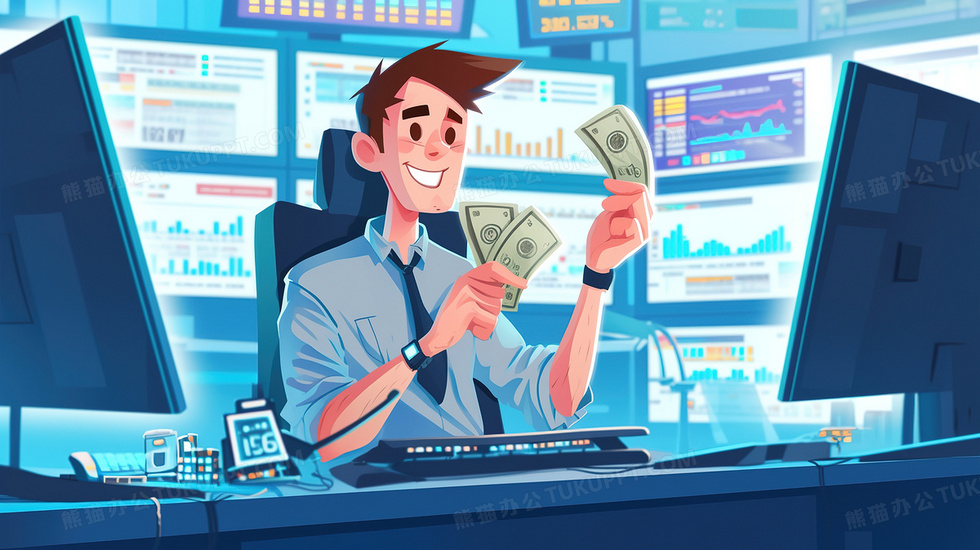 本作品内容为股票上涨手拿钞票的男士插画, 格式为 jpg, 大小3 MB, 图片尺寸为2912 x 1632, 源文件无水印, 欢迎使用熊猫办公。 如认为平台内容涉嫌侵权,可通过邮件:tousu@tukuppt.com提出书面通知,我们将及时处理。