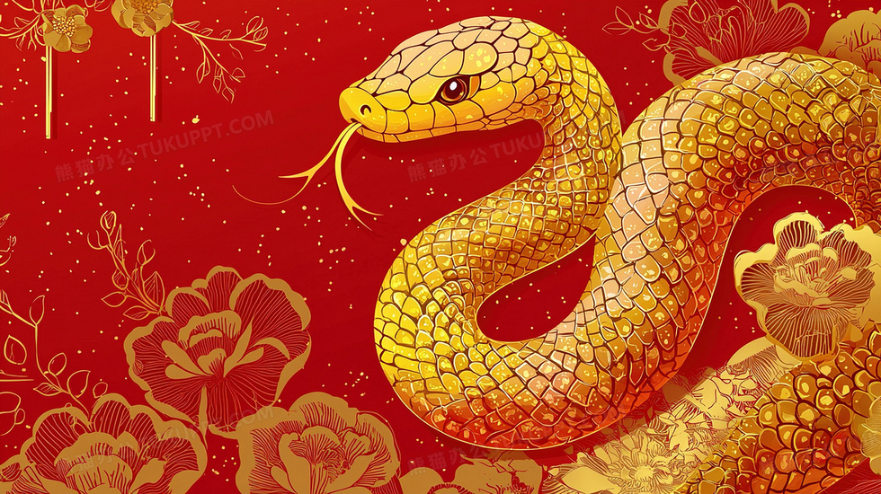 本作品内容为金色盘旋蛇蛇年植物花卉插画, 格式为 jpg, 大小4 MB, 图片尺寸为2912 x 1632, 源文件无水印, 欢迎使用熊猫办公。 如认为平台内容涉嫌侵权,可通过邮件:tousu@tukuppt.com提出书面通知,我们将及时处理。