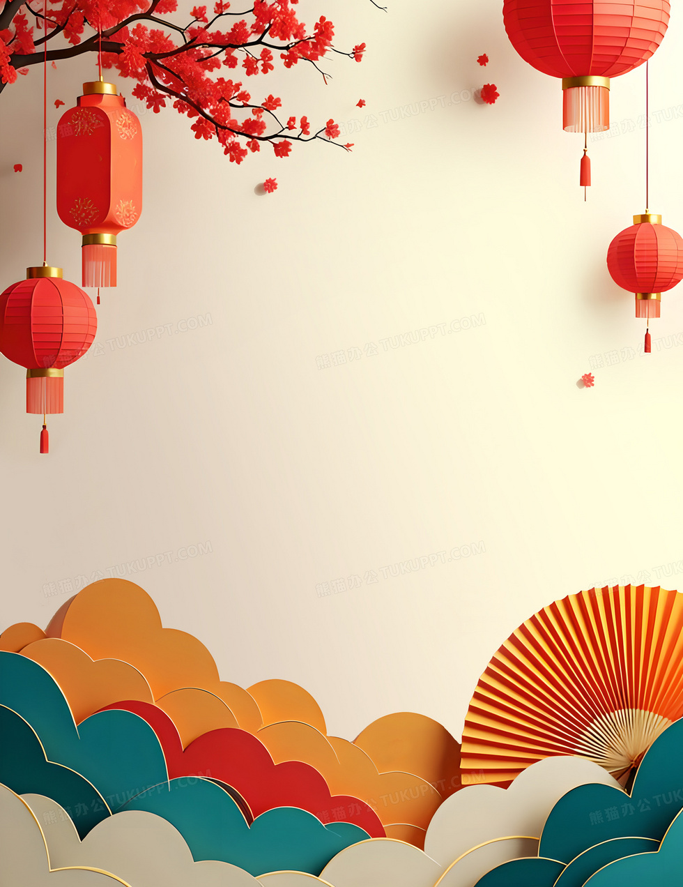 本作品内容为喜庆节日灯笼折扇剪纸背景, 格式为 jpg, 大小6 MB, 图片尺寸为2368 x 3072, 作品中背景图片无需修改, 源文件无水印,可以直接使用, 欢迎使用熊猫办公。 如认为平台内容涉嫌侵权,可通过邮件:tousu@tukuppt.com提出书面通知,我们将及时处理。